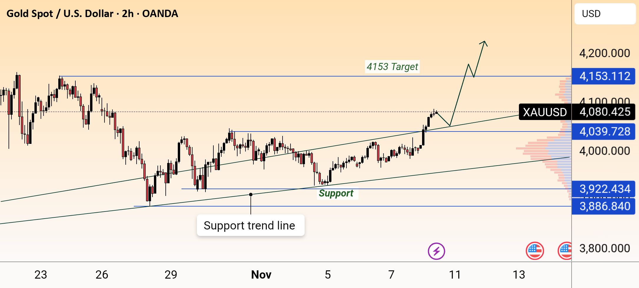 در حال حاضر، قیمت طلا در حوالی ۴,۰۸۰ دلار معامله می‌شود و پس از برخورد موفق به خط روند حمایتی، یک حرکت صعودی قدرتمند را به نمایش گذاشته است. این بازگشت قیمت نشان می‌دهد که خریداران کنترل بازار را در دست دارند.