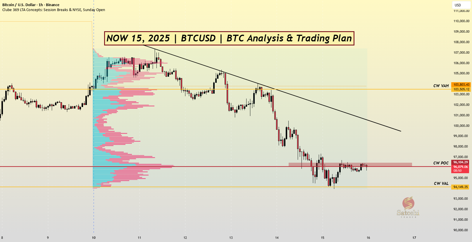 - محدوده ورود احتمالی: $۹۵,۰۰۰–$۹۶,۰۰۰ (یا سفارش Sell Limit نزدیک POC در $۹۶,۱۰۴)