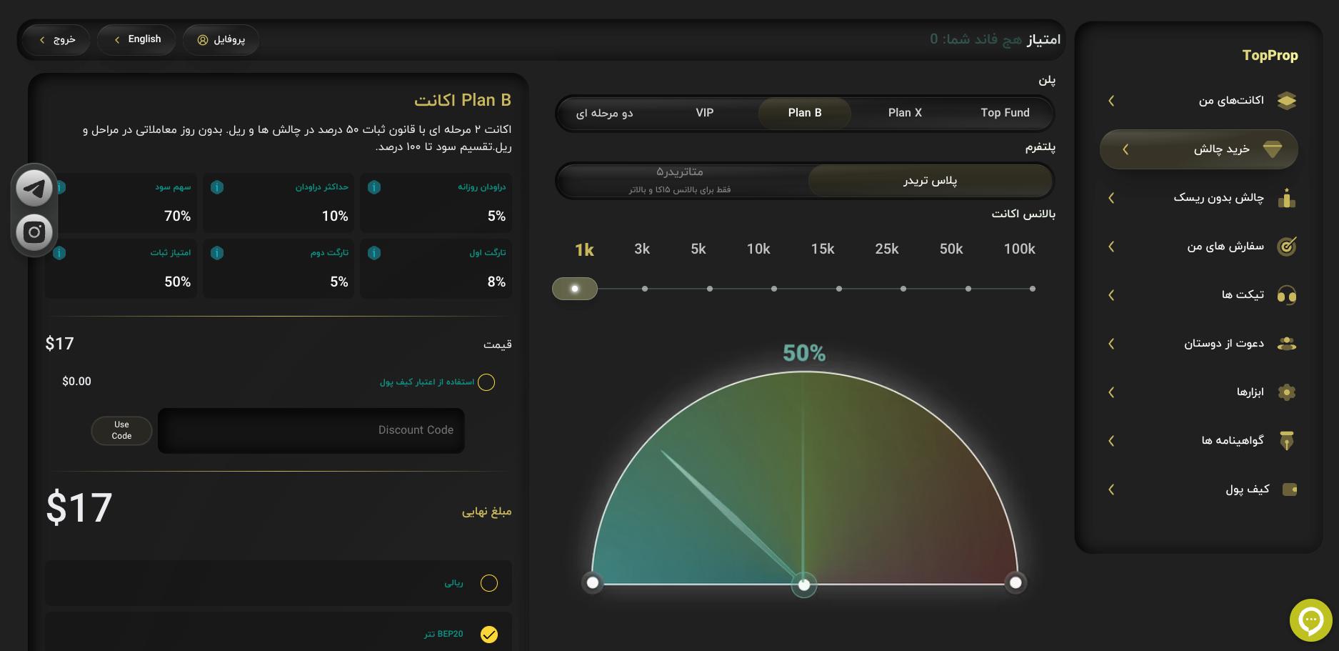 مرحله ۱: انتخاب دقیق پلن معاملاتی: ابتدا به وبسایت رسمی تاپ پراپ مراجعه کرده و از بین پلن های TOP FUND، PlanX، PlanB، VIP و دو مرحله ای، گزینه ای که با استراتژی، تحمل ریسک و اهداف شما همخوانی دارد را انتخاب کنید.